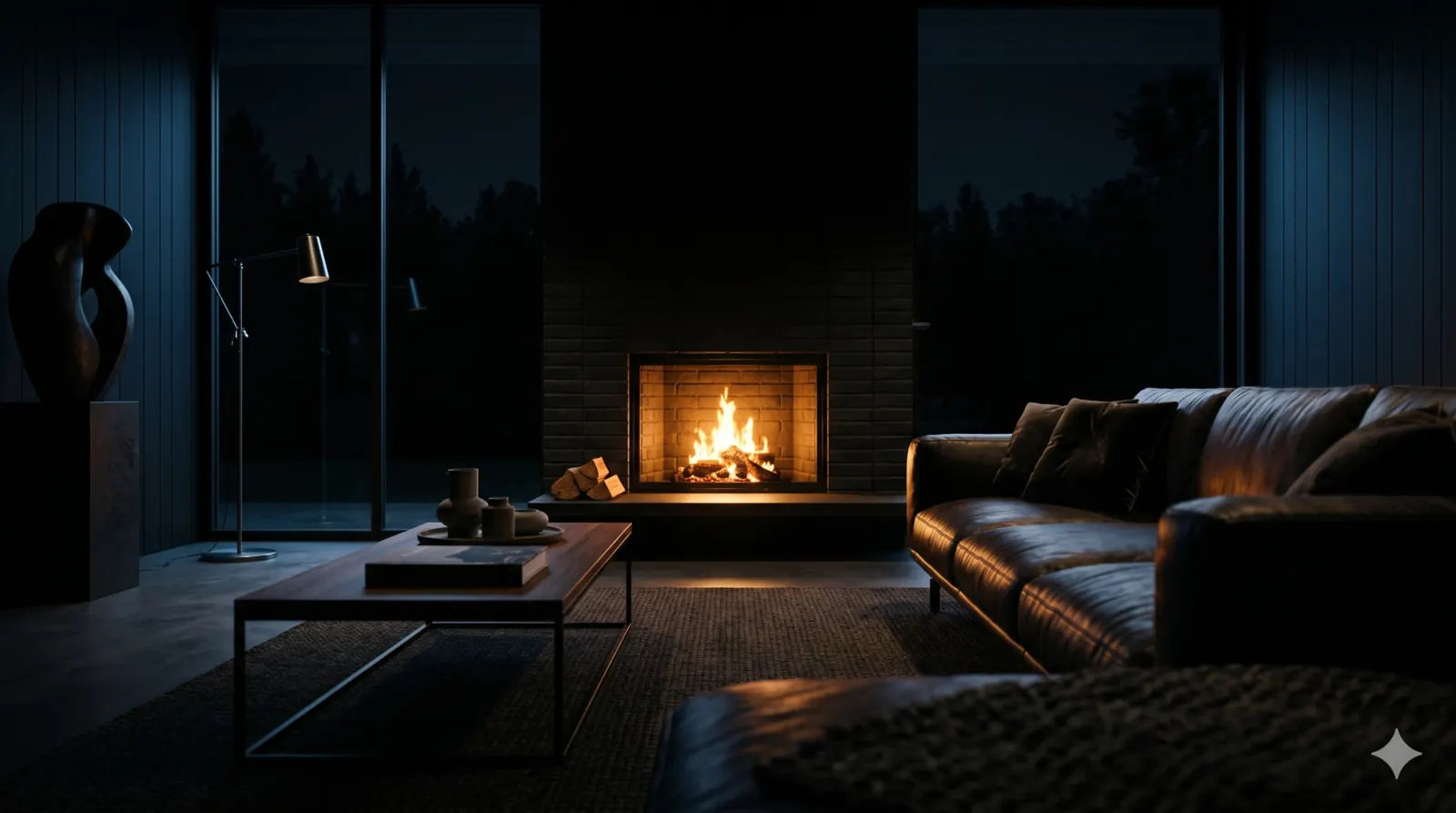 Sala dark, lareira acesa. Conversa sem pressa.