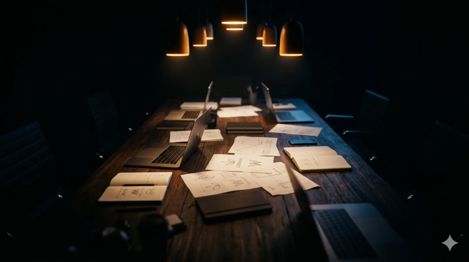 Mesa coletiva, luz âmbar. Trabalho profundo.