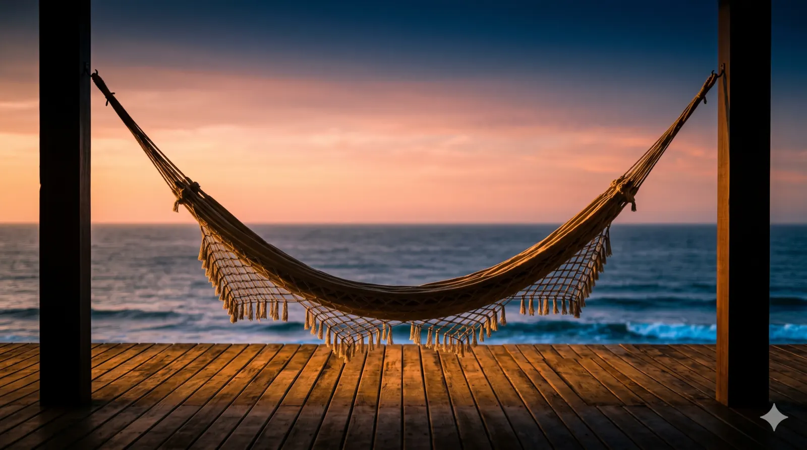 Varanda com rede, pôr do sol. Primeiras decisões difíceis.